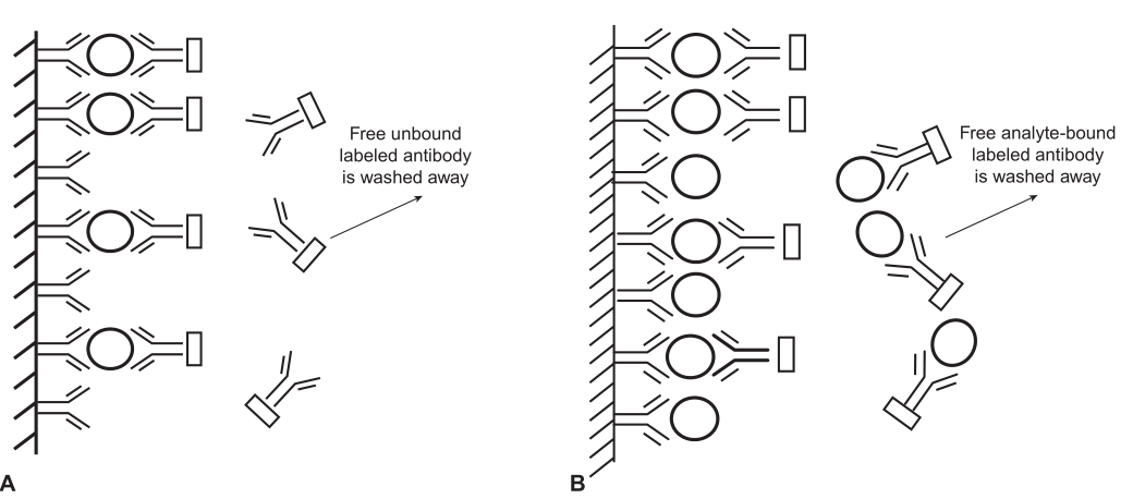 Я уже писала, что выделяют конкурентный ИФА и «сэндвич» ИФА. Так вот, хук-эффект больше характерен для «сэндвич» ИФА. Во время реакции искомый АГ (в сыворотке/плазме) соединяется с двумя видами АТ, образуя так называемый «сэндвич» с АГ посредине двух антител (см.рис 1А). При этом сначала АГ соединяется с антителом-ловушкой, которое захватывает АГ из образца пациента. А потом с АТ, которое соединено с меткой. Эта метка необходима для образования сигнала, который считывает прибор. Далее непрореагировавшие АТ и АГ, которые не образовали «сэндвич», удаляются многократным промыванием.