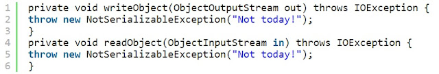 Обратите внимание, что оба метода объявлены как private, поскольку это гарантирует что методы не будут переопределены или перезагружены. Весь фокус в том, что виртуальная машина при вызове соответствующего метода автоматически проверяет, не были ли они объявлены в классе объекта. Виртуальная машина в любое время может вызвать private методы вашего класса, но другие объекты этого сделать не смогут. Таким образом обеспечивается целостность класса и нормальная работа протокол сериализации.