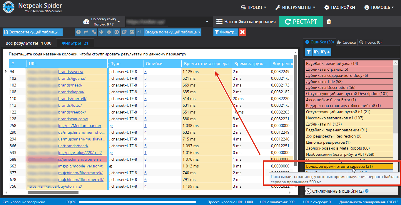 Инструмент, который позволяет проводить комплексный Seo-аудит web-сайта, выявляя все имеющиеся ошибки. Его огромный плюс заключается в способности проводить сканирование времени ответа сервера сайта на всех его страницах. В отчёте, самые медленные из них будут подсвечены.
