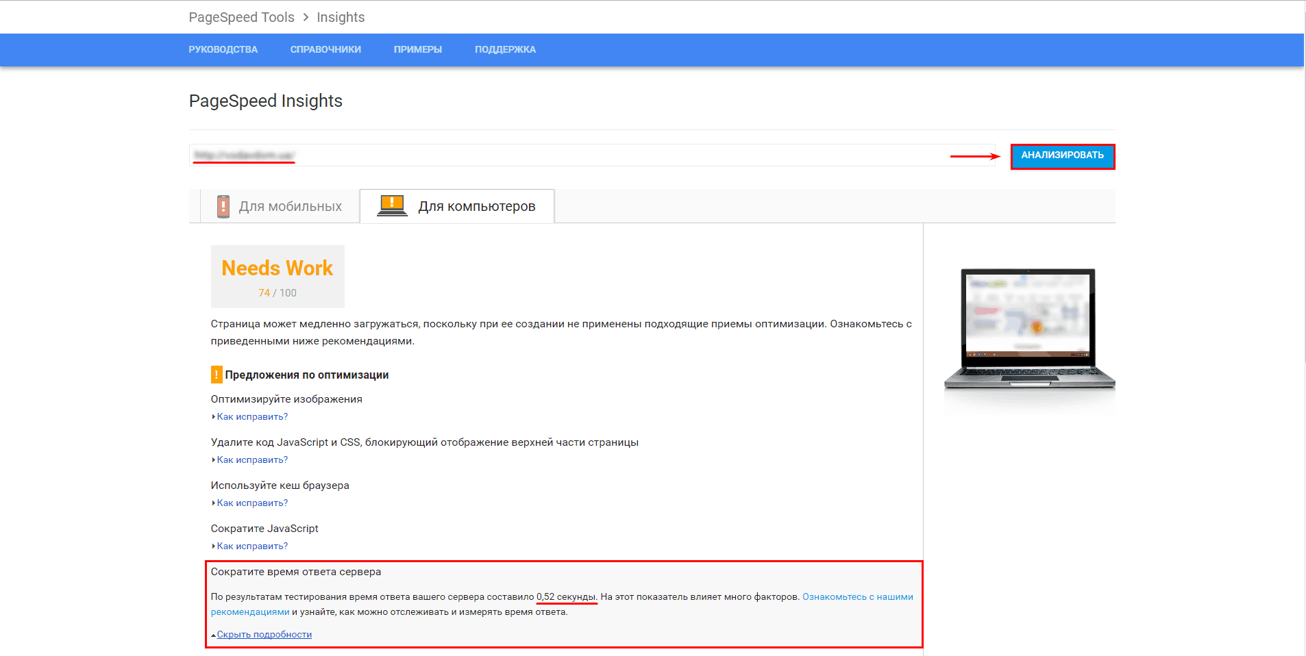 Проверку можно проводить не только со стационарных ПК, но и с мобильных гаджетов. Достаточно указать доменное имя и кликнуть «Анализировать». В ответе будут представлены результаты имитации загрузки web-страницы и соответствующие данные по ней. В модуле «Оптимизация» можно будет увидеть практические рекомендации, которые помогут сократить время ответа сервера, а также показатели экономии времени в миллисекундах.
