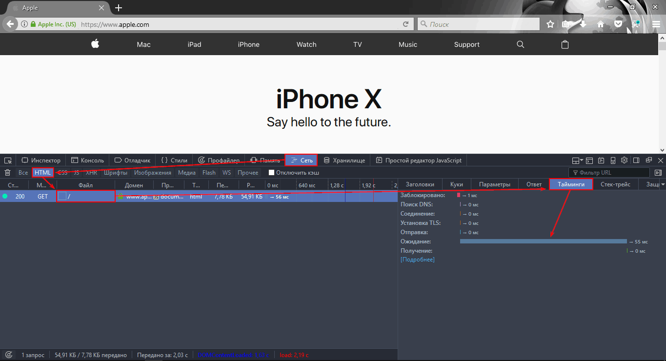 Он предоставляет более, чем исчерпывающую информацию о времени подключения, TTFB, времени инициализации TLS/SSL (если используется), а также о загрузке отдельных элементов веб-страницы.