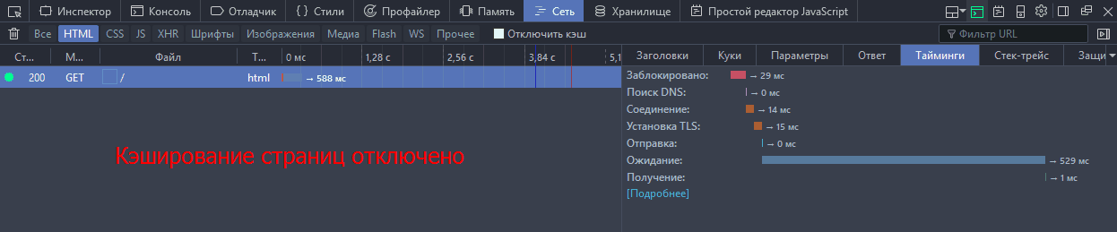 TTFB с отключённым кэшированием: